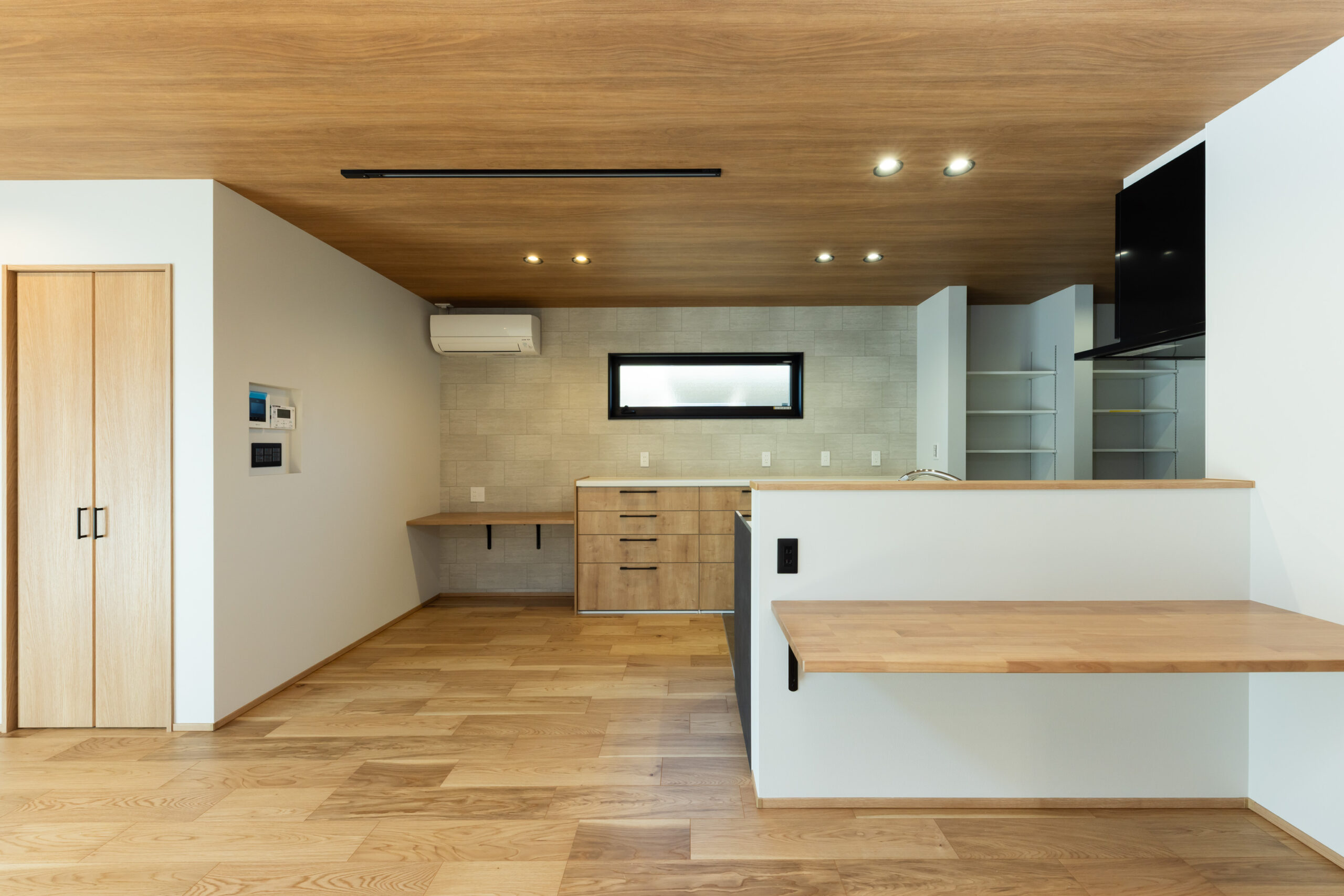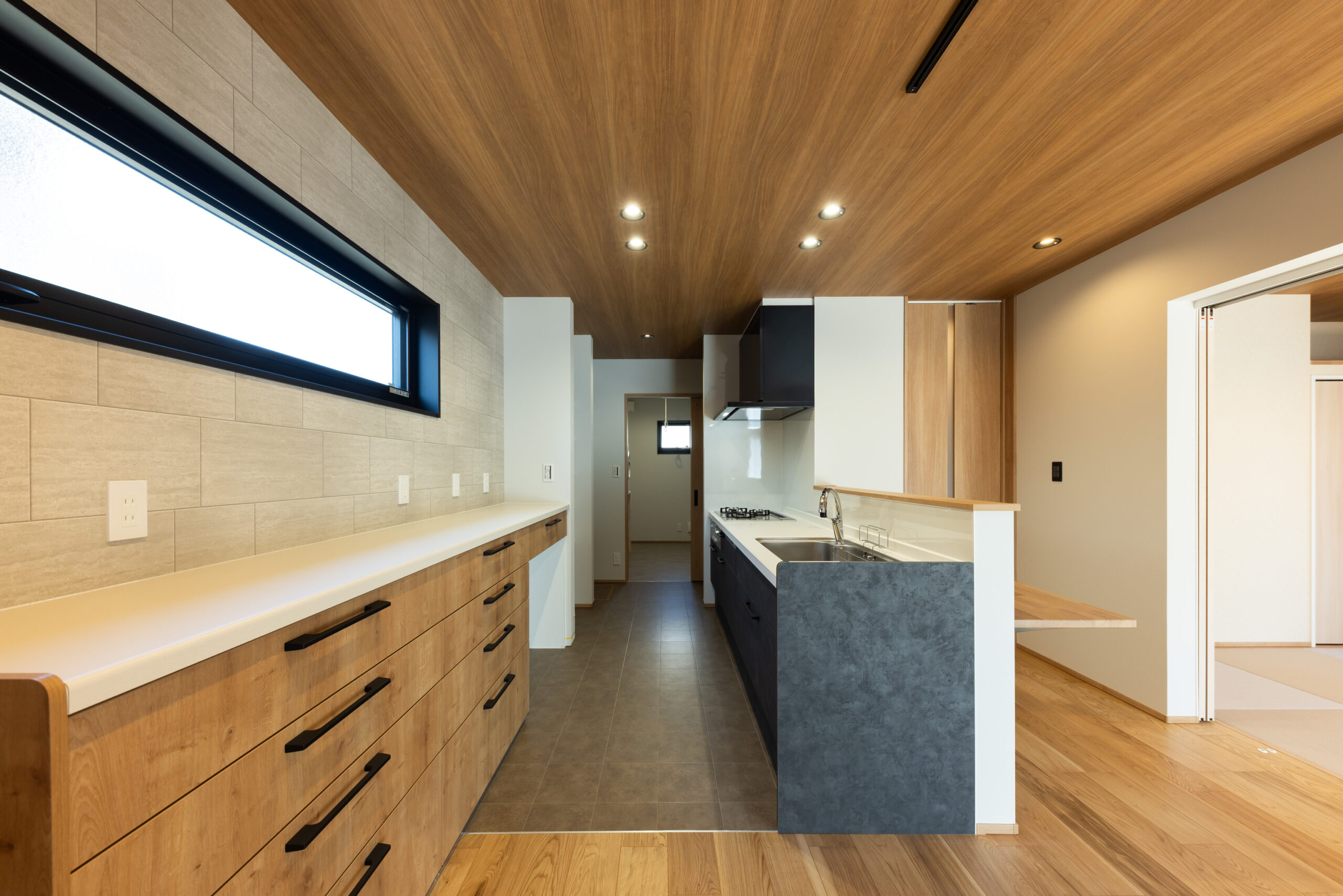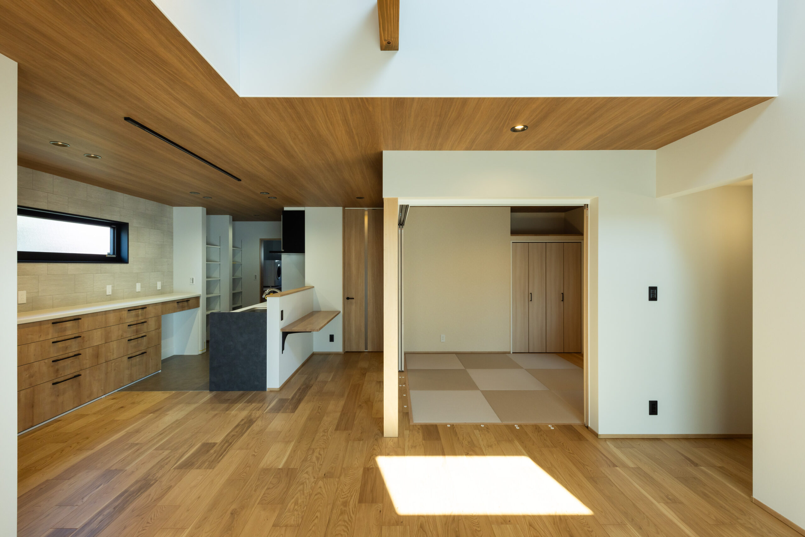 段差と勾配屋根を活かした外観は、シンプルながらも立体感のある印象的な佇まいに。室内は、LDKを中心に各空間がゆるやかにつながる間取りとし、視線の抜けと広がりを感じられる開放的な空間構成を実現しました。キッチンから水まわりへの動線もスムーズにまとめ、日々の家事負担を軽減。さらに、用途に応じて使い分けられる個室や収納をバランスよく配置し、暮らしやすさにも配慮しています。高低差を活かした空間設計と機能性を両立した、家族が心地よく過ごせる住まいです。