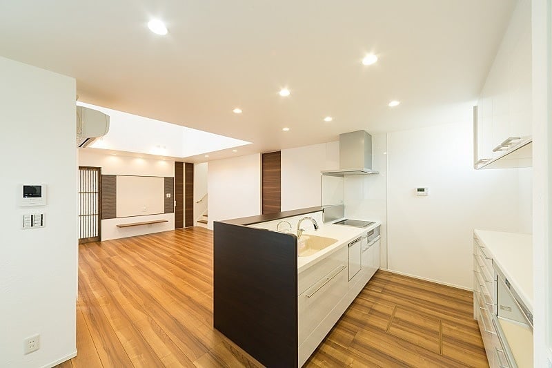 吹き抜けのあるLDKには、天助にベイツガの羽目板、壁には漆喰を塗ることで、自然素材の