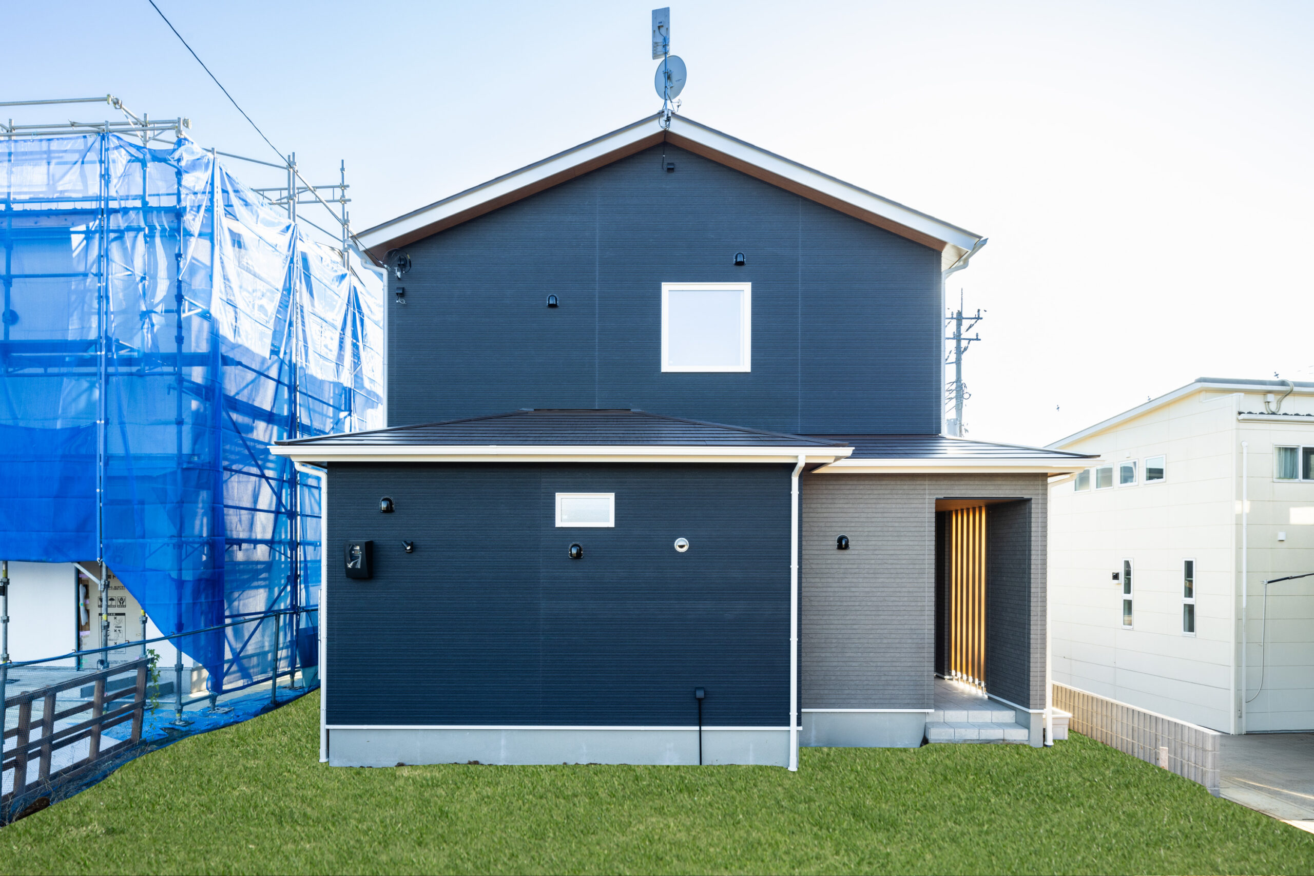 紺、グレー、ウッド調の外壁がコントラストとなった外観。室内は白を基調に、木目やクリーム色で空間を統一することでナチュラルな雰囲気の可愛らしい空間です。LDKには、化粧柱で仕切りをつくらずに空間を分けた和室を設けることで、ナチュラルテイストを崩すことなく和を感じることができます。キッチン向かいの造作カウンターで勉強をするお子様の様子を眺めながら家事をできるのも奥様の工夫ポイントの一つです。また、1階洗面脱衣室から2階へ上り、サンルームで室内干しをした後、そのまま隣のウォークインクローゼットへ収納できる動線が家事ラクを実現します。生活のしやすさを考えたお住まいが完成しました。