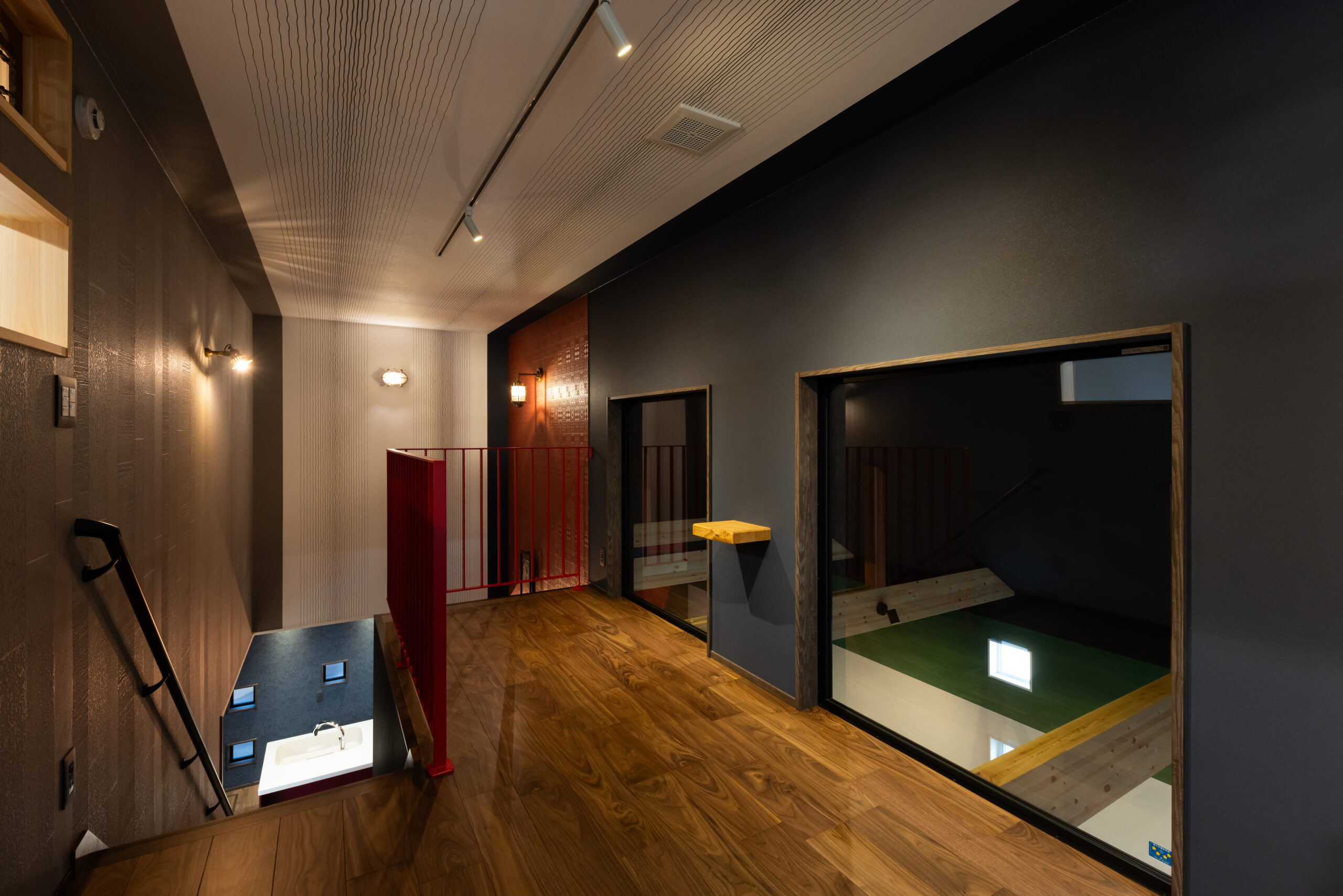 ご夫婦それぞれが趣味を満喫できる離れ。吹き抜けと天然素材の板張りが開放感と木の温もりを感じさせるフリースペースは、友人を招いて卓球ができる広々空間です。ご主人の愛車を秘密基地のような2階の窓や、キッチン向かいのスペースから眺められるインナーガレージは、趣味のスポーツカーをイメージした遊び心のある壁面デザインもこだわりの一つ。お施主様ご支給の木材を余すことなく随所に施した造作棚や造作のニッチ、以前住んでいた住居の欄間を取り入れた2階など、遊び心が詰まった大人の秘密基地が完成しました。