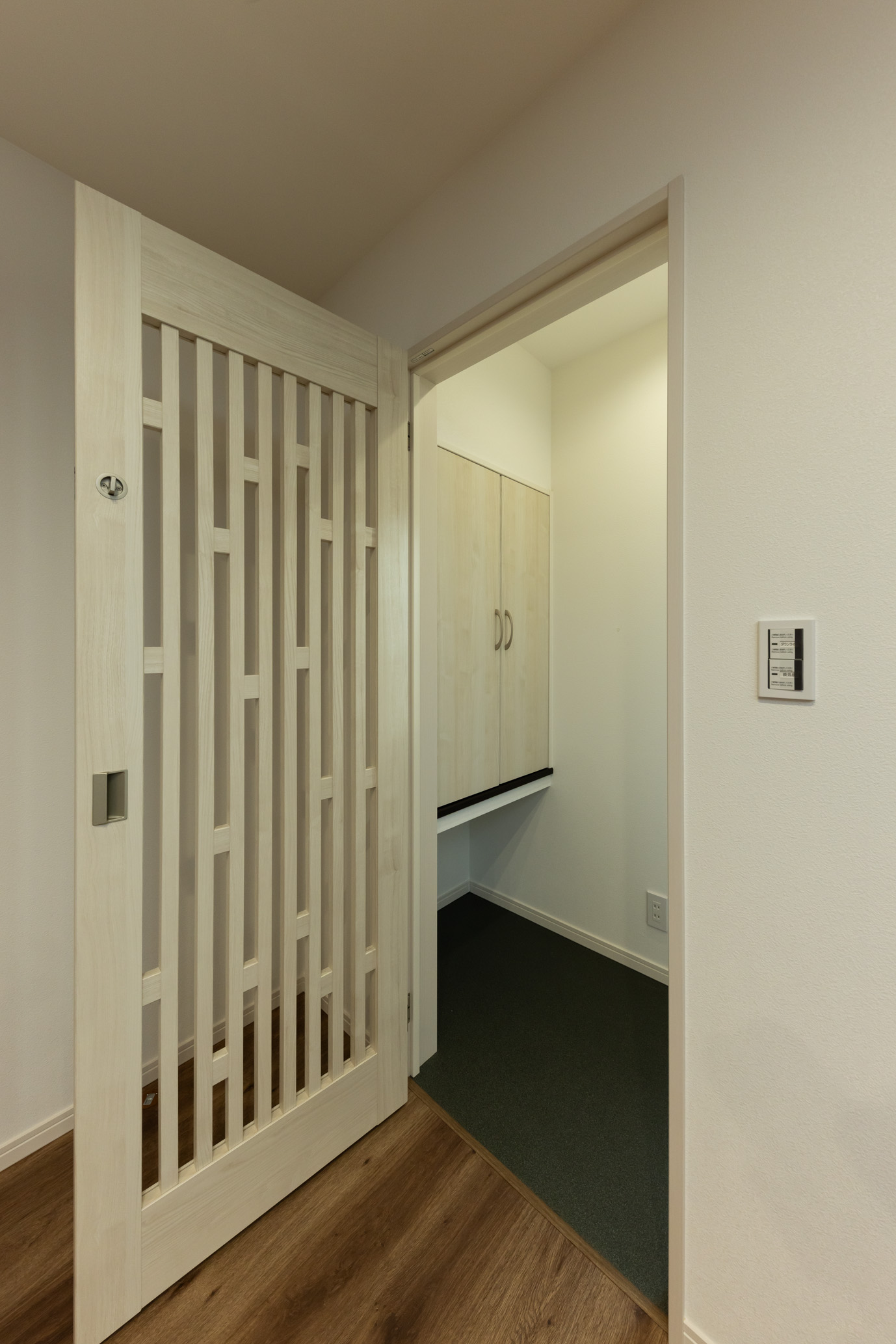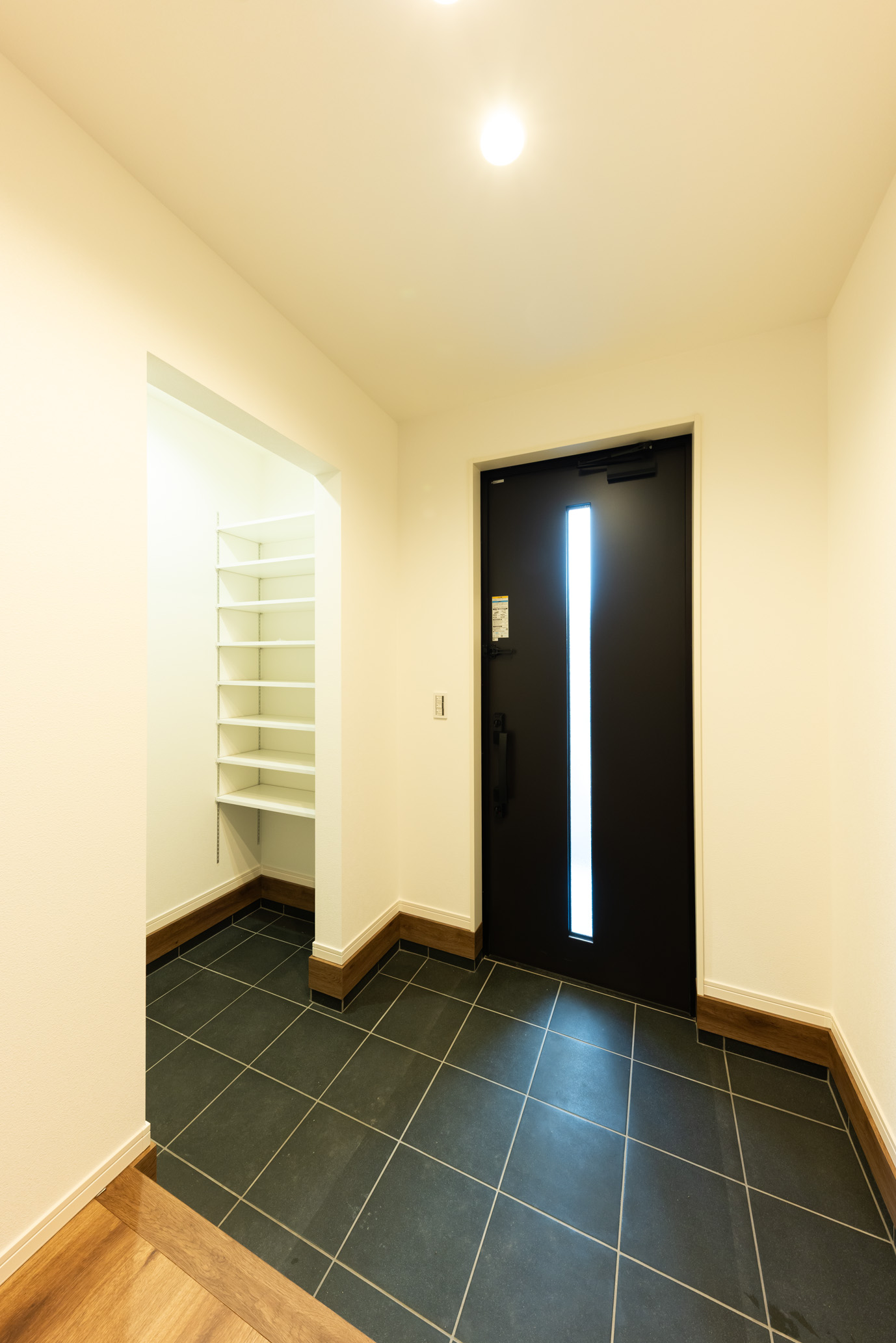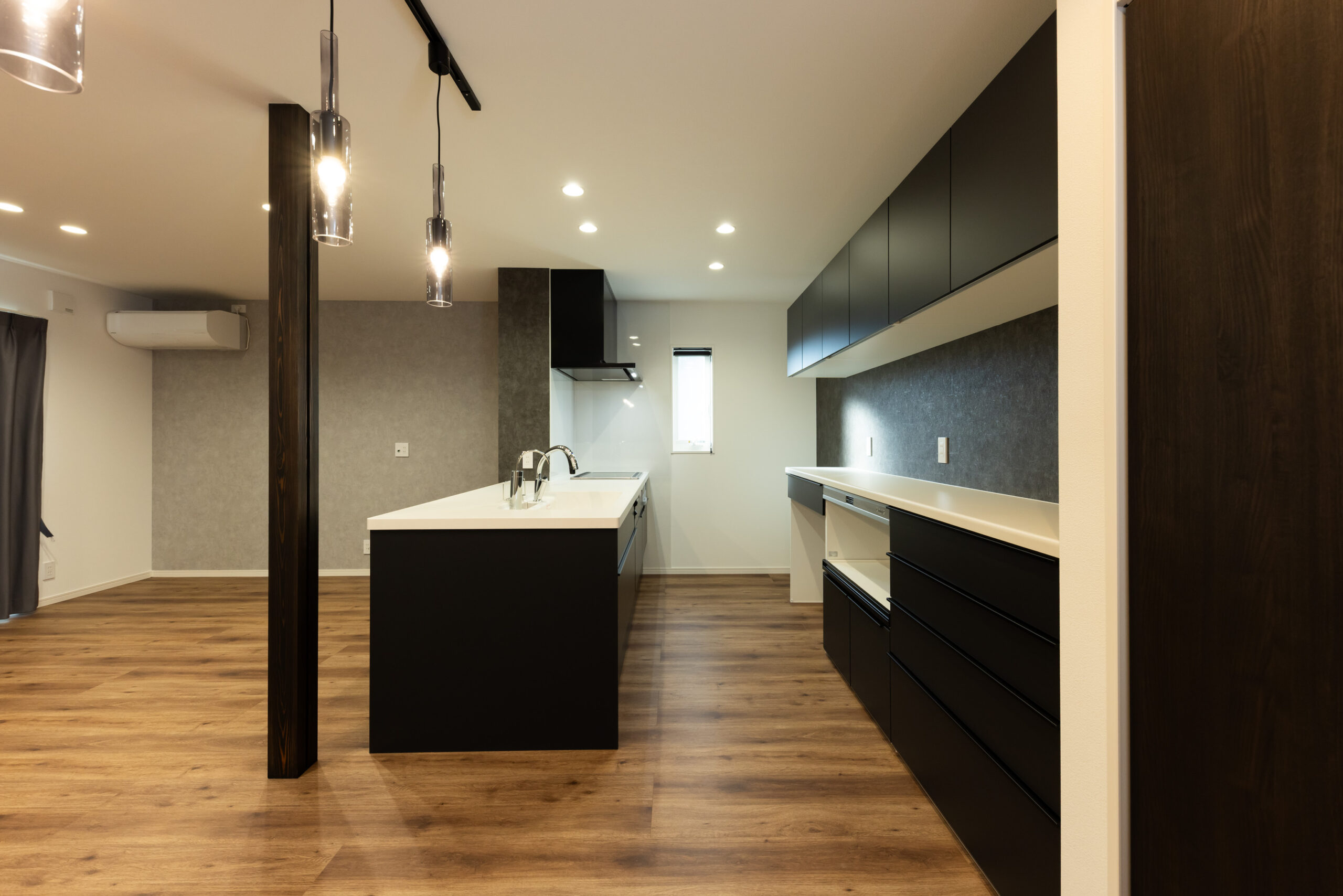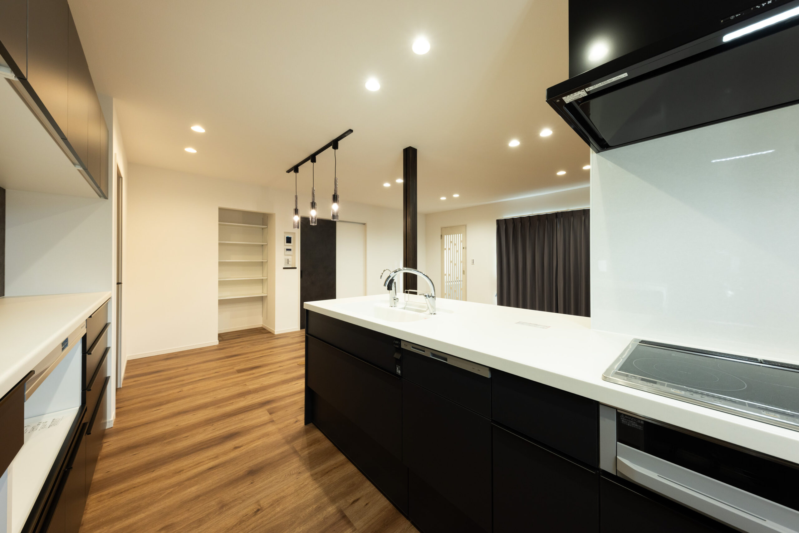 ブラックを基調としたシンプルモダンな外観は、スクエアなフォルムと素材の切り替えにより、重圧感と立体感を演出。玄関からすぐにキッチンとリビングへつながるスムーズな動線を確保し、家事効率の良さと開放感を両立しました。ペニンシュラ型キッチンには、黒のアクセントクロスとペンダント照明を組み合わせ、空間を引き締めながらデザイン性の高い上質な雰囲気に。リビングの一角にはキャットスペースを設け、家族の気配を感じながら、猫が安心して過ごせる居場所をつくりました。さらに、ひとりで静かに過ごせる書庫も備え、読書や作業に集中できる落ち着いた時間を確保。洗脳されたデザインの中に、快適さと安らぎを丁寧に取り入れた理想のお住まいです。
