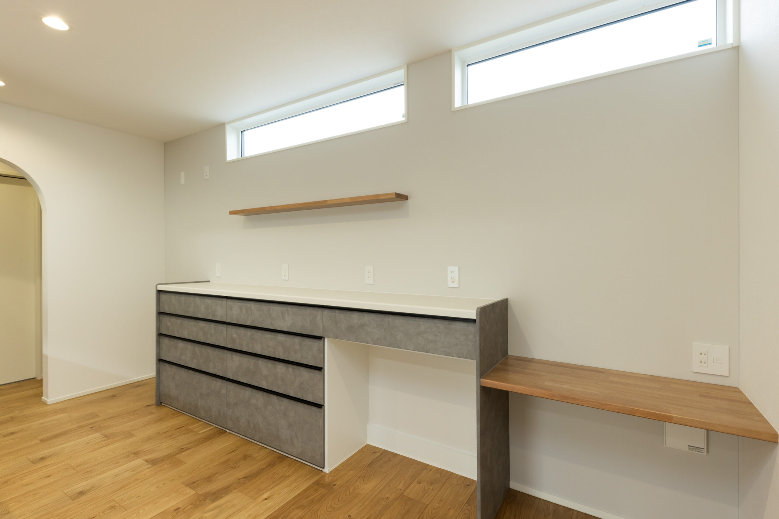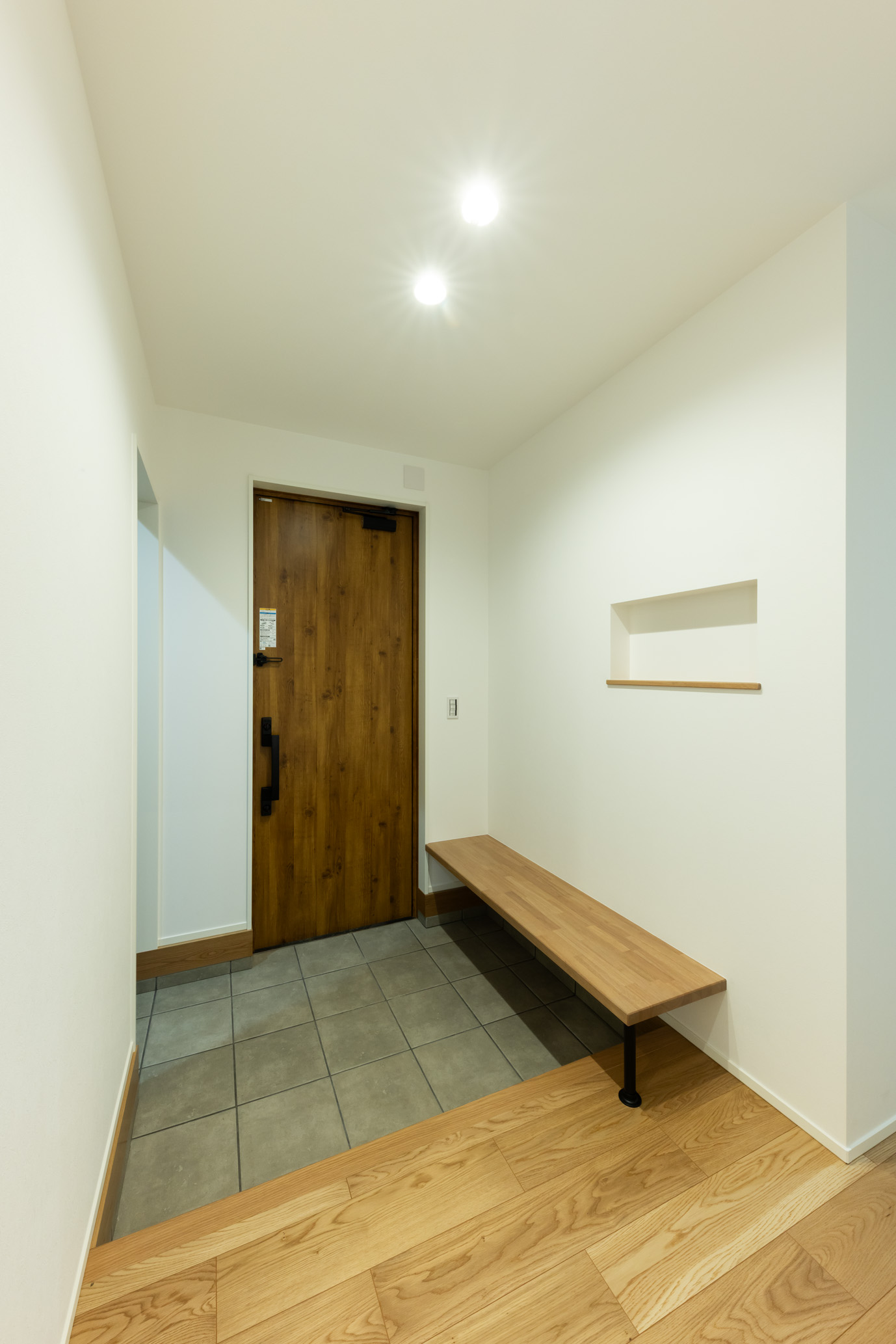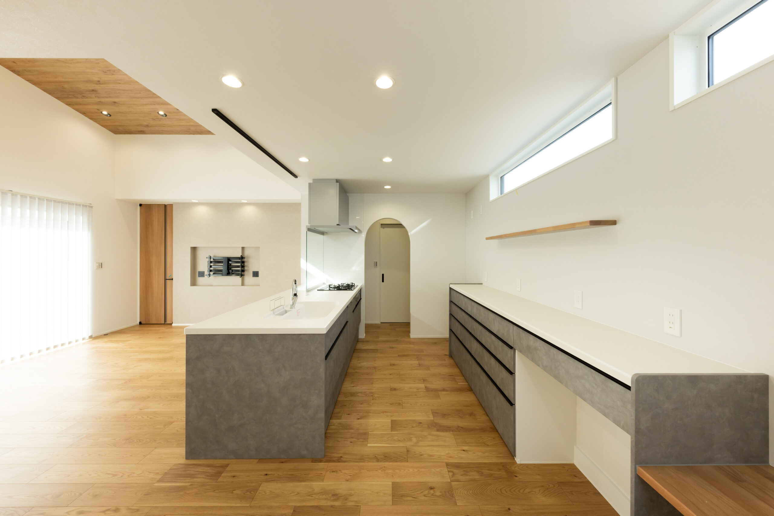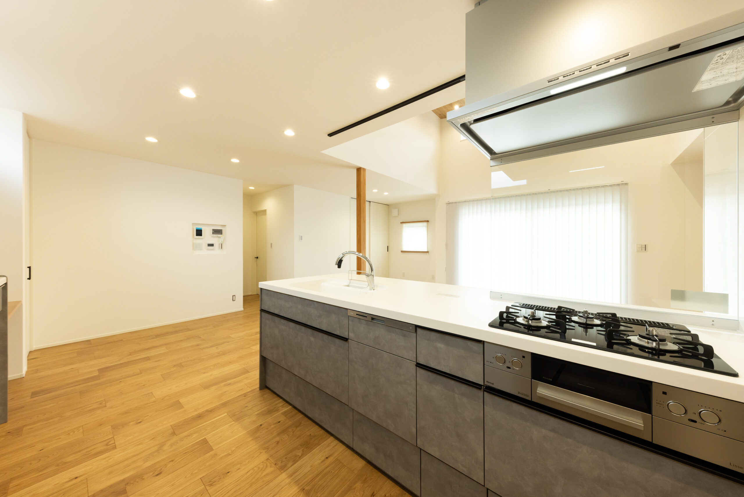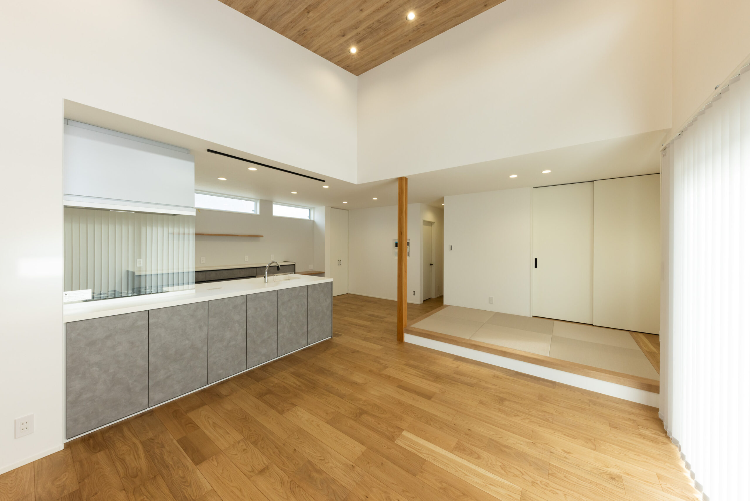 チャコールグレーの横ラインが美しい外壁に、奥行きのある玄関ポーチと木目の玄関扉を組み合わせた、重厚感と温かみを兼ね備えた平屋の外観。玄関から洗面室・脱衣所・浴室へとスムーズにつながる動線により、外出先から戻ったあとの身支度も快適で、生活空間を清潔に保ちやすい設計です。キッチンは開放感のあるペニンシュラ型を採用し、すぐ横には小上がり和室を配置。家事をしながら家族の様子を見守れる安心感があり、くつろぎや来客対応にも活躍します。さらにリビングには吹き抜けを設け、平屋でありながら縦の広がりを感じる、明るく開放的な住まいに仕上げました。日々の動線や居心地に配慮した、快適な暮らしを叶える理想のお住まいです。