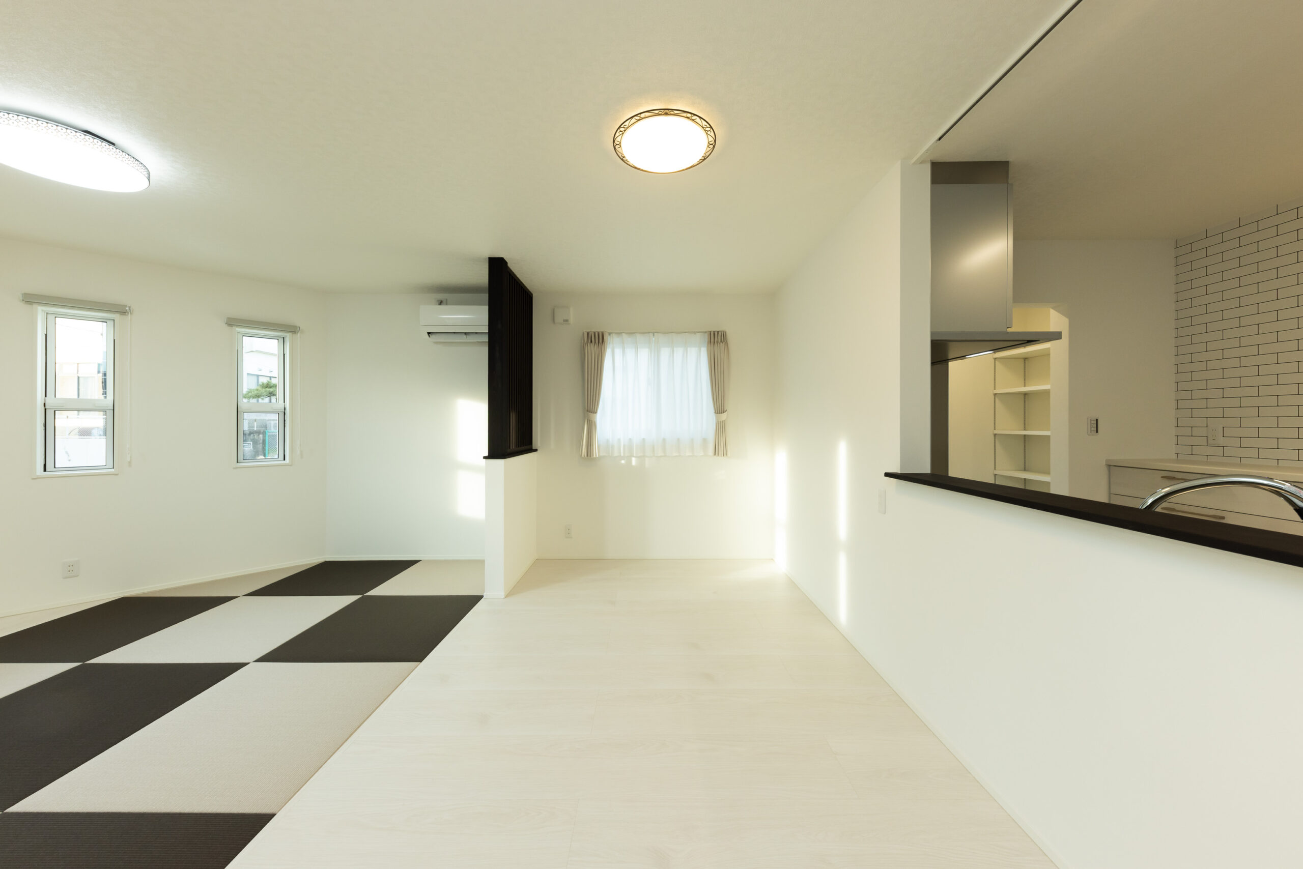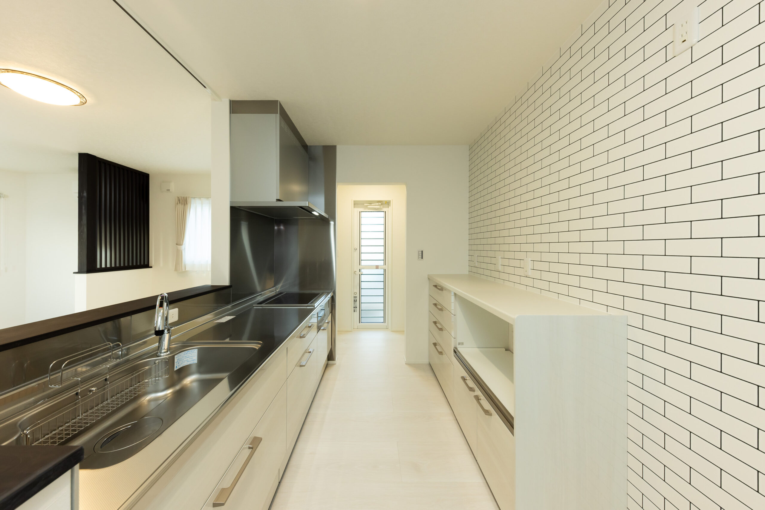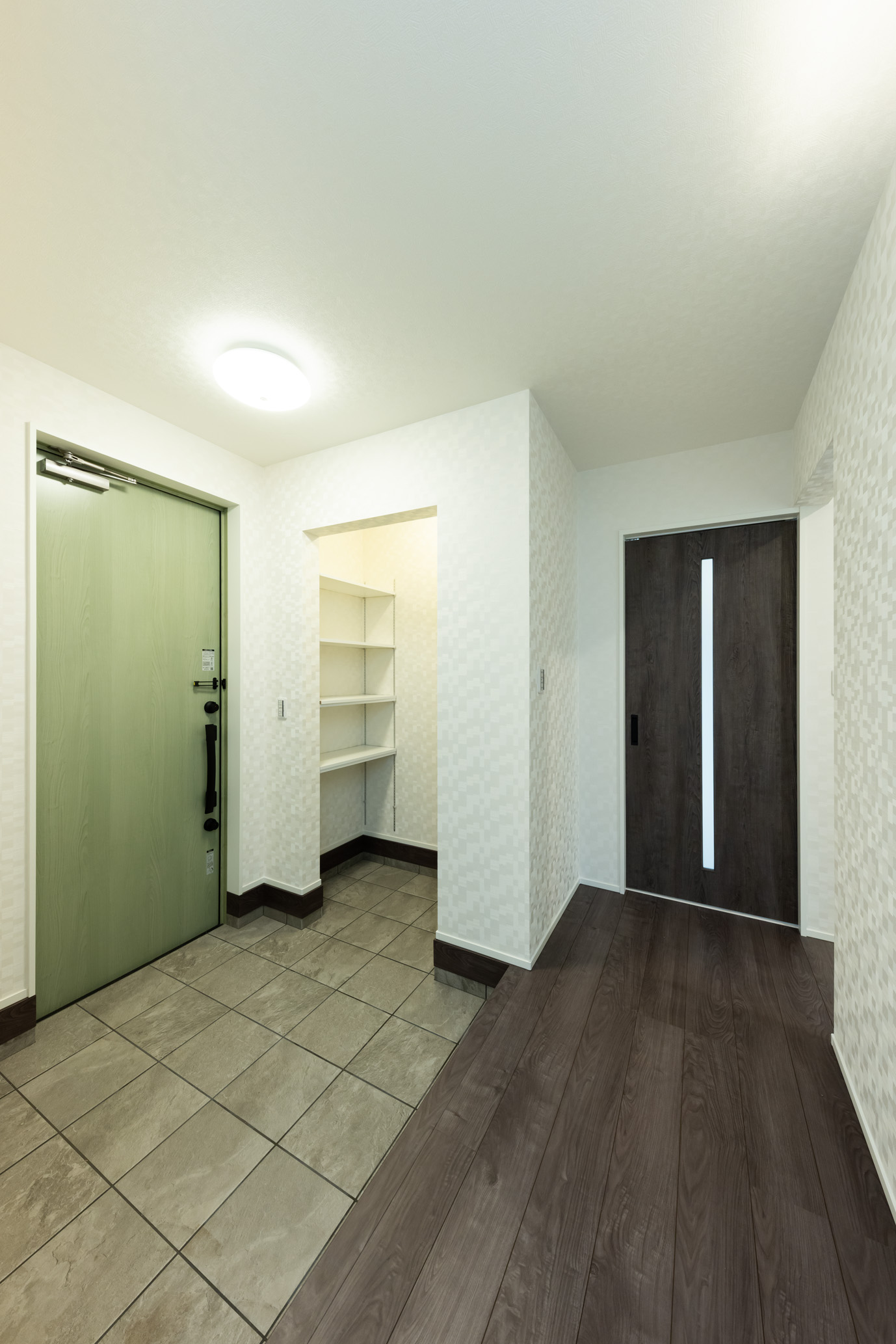 グレージュを基調に、素材のコントラストで魅せる外観。木目調サイディングと立体的なデザインが、やさしい雰囲気の中に印象深さをもたらします。室内は白で統一し、すっきりと洗練された印象に。自然光が美しく映え、明るく穏やかな空間が広がります。淡いトーンのフローリングが白を基調とした室内に自然になじみ、開放感のあるリビングを演出しています。また、生活動線を意識して収納を配置することで、使いたい場所に必要な物をしまえる計画に。家事や身支度がスムーズになり、日々の暮らしにゆとりをもたらす住まいです。素材の美しさと洗練された空間設計が響き合う、上質な暮らしを叶える理想の住まいです。