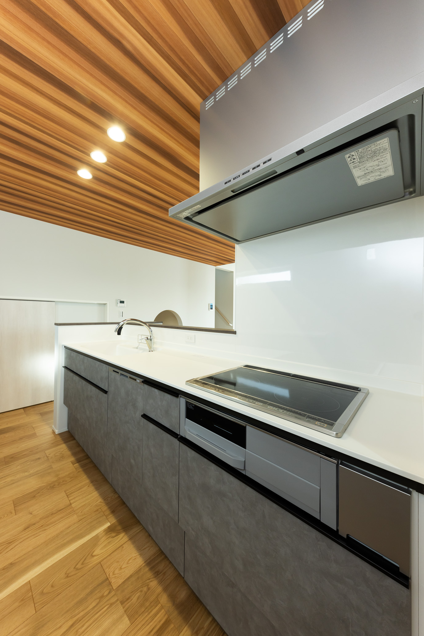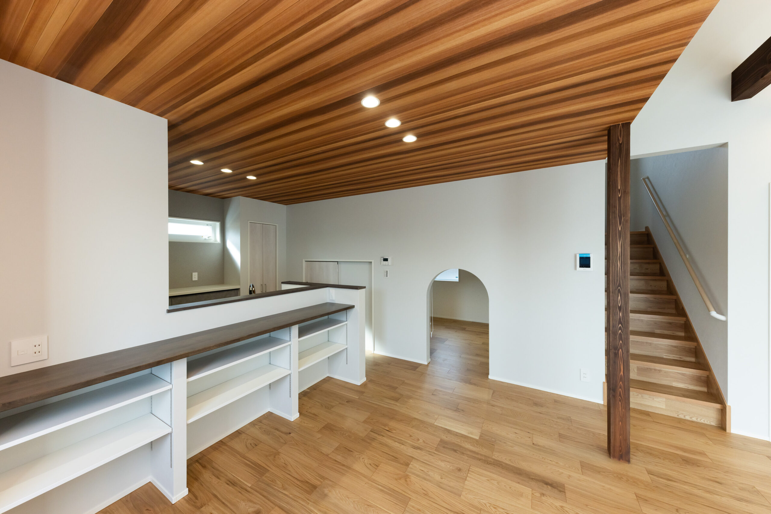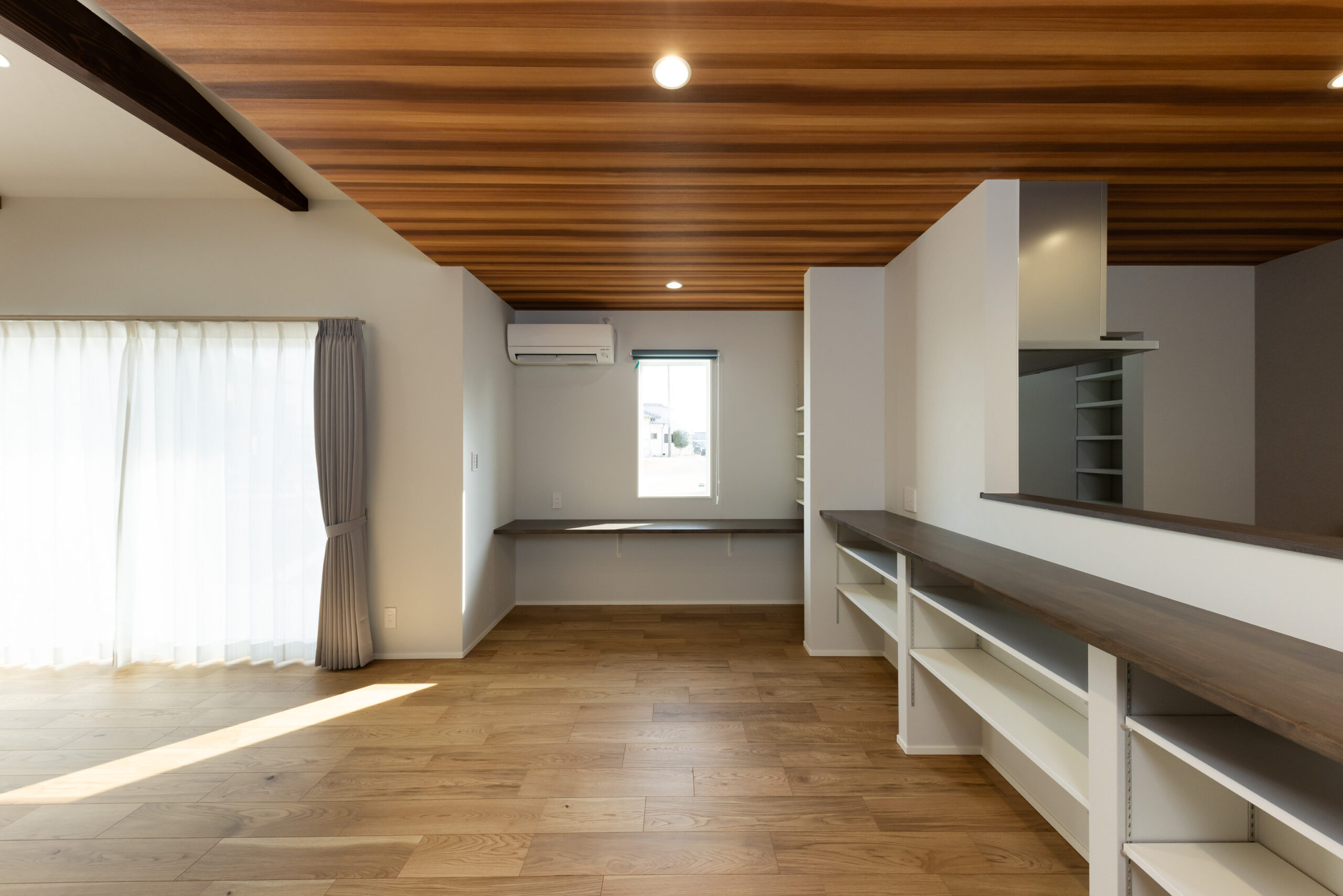 チャコールグレーの横張りサイディングを基調に、玄関まわりと軒天に木目調素材を組み合わせた外観は、落ち着いた重厚感の中に温もりを感じさせるシンプルモダンな佇まい。室内は、白を基調とした勾配天井に濃色の化粧梁を現しでデザインし、視線が上へと抜ける伸びやかなLDK空間を演出。キッチン上部には木目柄の天井クロスを用いた下がり天井を採用し、空間に奥行きと温もりのあるメリハリをもたらしています。キッチン横には8帖分の床下収納を確保し、食材や日用品をすっきりと収納。生活感を抑えながらキッチンまわりを美しく保てるよう配慮しました。和室とワークスペースも設け、くつろぎと作業の場を両立。家族の気配を感じながら、それぞれの時間を心地よく過ごせる住まいに仕上がりました。デザイン性と機能性、収納力を兼ね備え、日々の暮らしを豊かに整える理想のお住まいです。