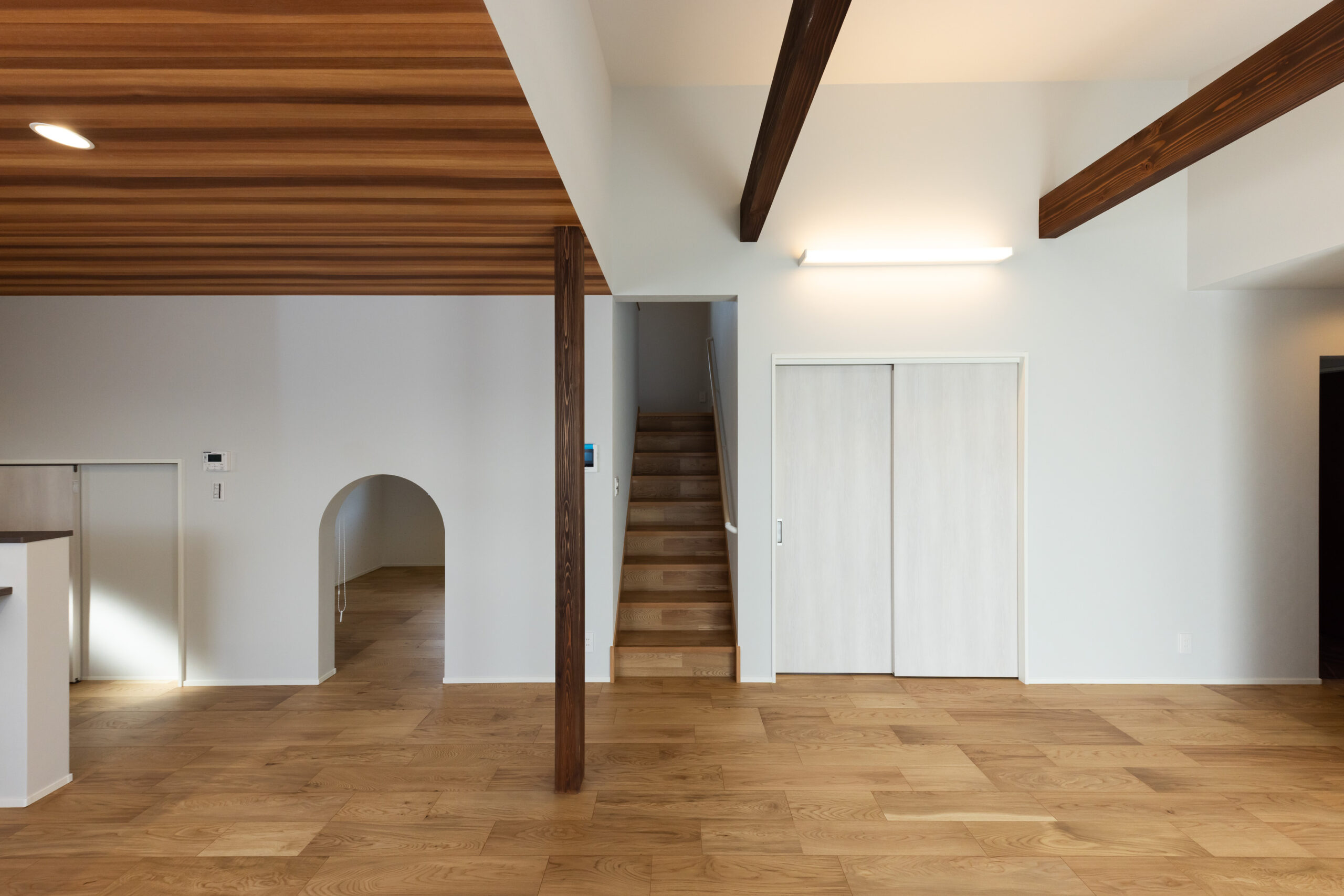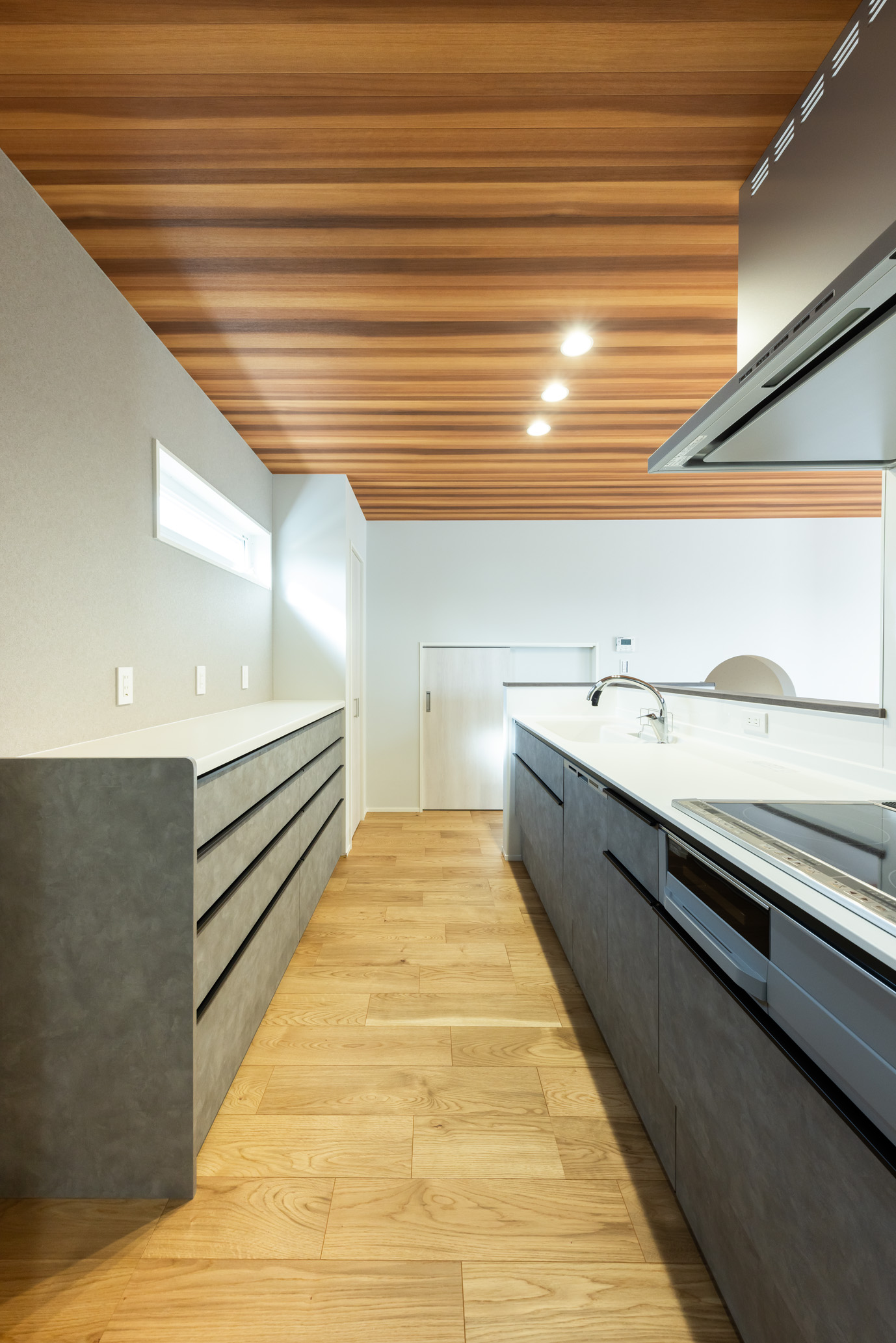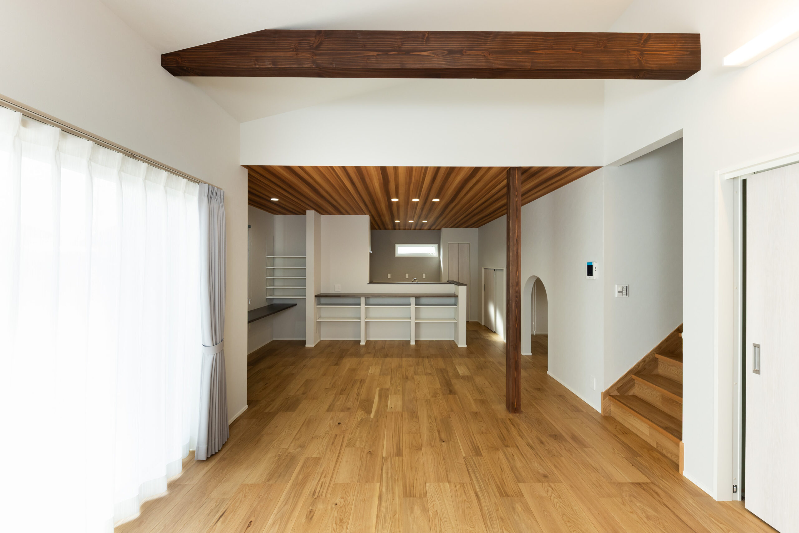 チャコールグレーの横張りサイディングを基調に、玄関まわりと軒天に木目調素材を組み合わせた外観は、落ち着いた重厚感の中に温もりを感じさせるシンプルモダンな佇まい。室内は、白を基調とした勾配天井に濃色の化粧梁を現しでデザインし、視線が上へと抜ける伸びやかなLDK空間を演出。キッチン上部には木目柄の天井クロスを用いた下がり天井を採用し、空間に奥行きと温もりのあるメリハリをもたらしています。キッチン横には8帖分の床下収納を確保し、食材や日用品をすっきりと収納。生活感を抑えながらキッチンまわりを美しく保てるよう配慮しました。和室とワークスペースも設け、くつろぎと作業の場を両立。家族の気配を感じながら、それぞれの時間を心地よく過ごせる住まいに仕上がりました。デザイン性と機能性、収納力を兼ね備え、日々の暮らしを豊かに整える理想のお住まいです。