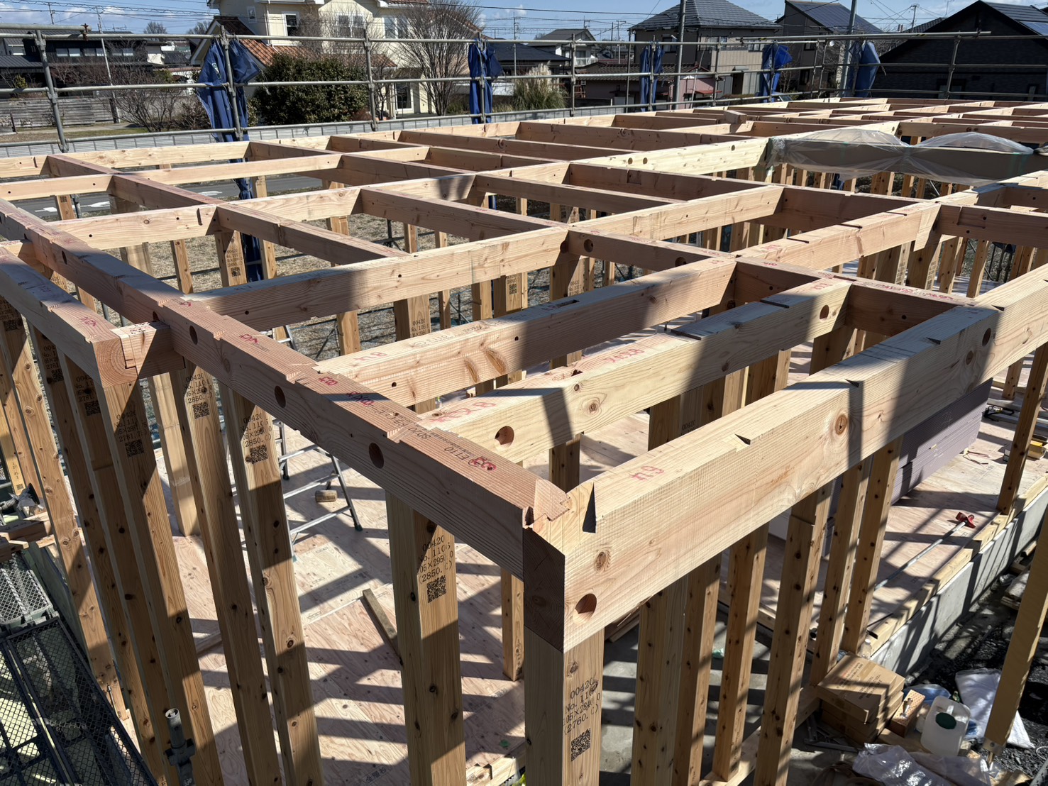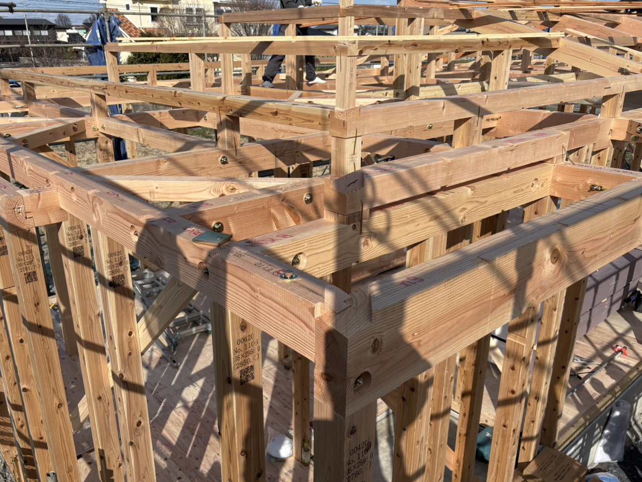 梁や桁を組みましたら、仮筋交いを入れ柱の水平を見ていきます。