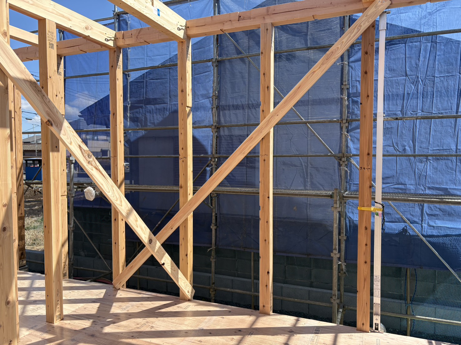 間柱や本物の筋交いを入れるまで、仮の筋交いを入れます