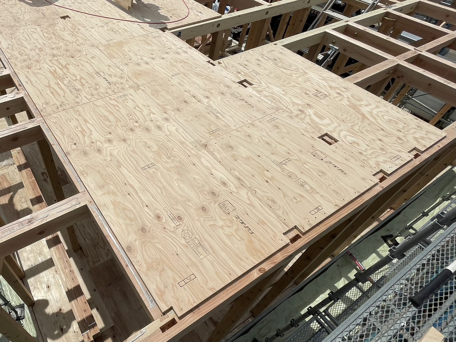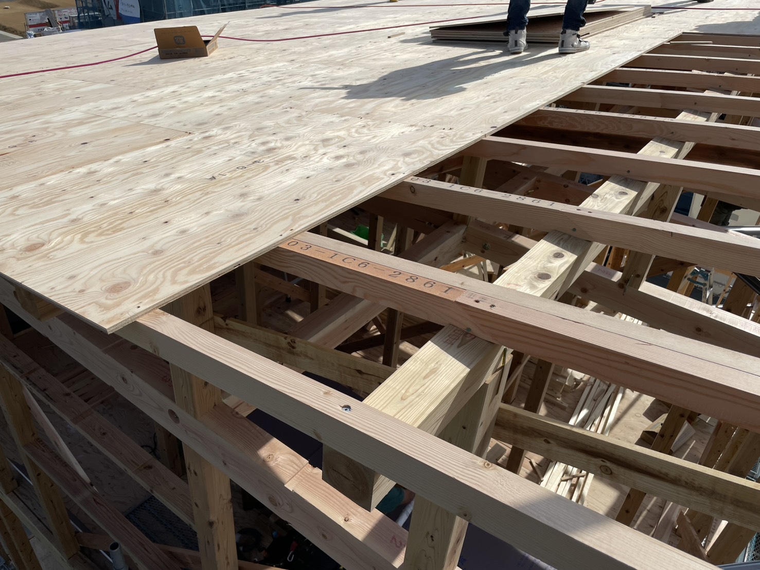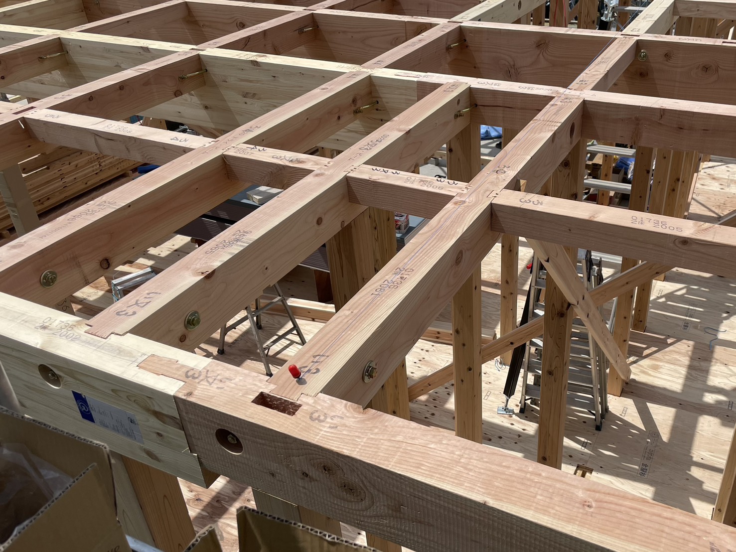 2階では床を敷き、柱と梁・桁を組んでいきます。
