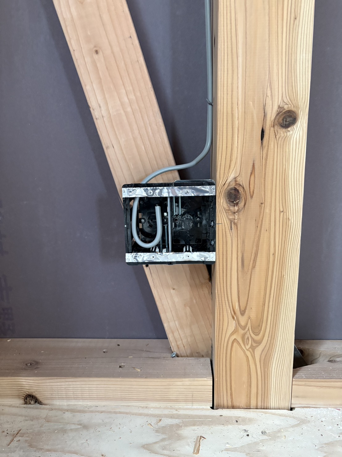 コンセントボックスは、図面に記載されている高さで柱に固定しています。